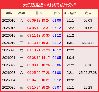连号分析:上期开出1组连号28,29,近10期前区连码共开出6次。本期分析不会开出连码组合。